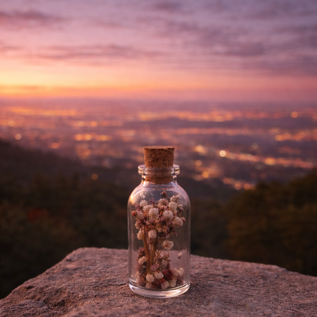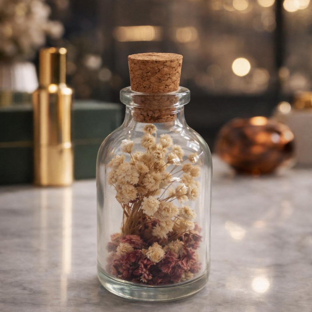 Bahar Zamanı, dinginliğin ve saf anların sembolü olarak tasarlanmış özel bir cam şişe hatıradır. Açık renkli kurutulmuş çiçekleri, zamansız bir sadelik sunarken mantar kapak detayı doğal ve sıcak bir görünüm kazandırır.