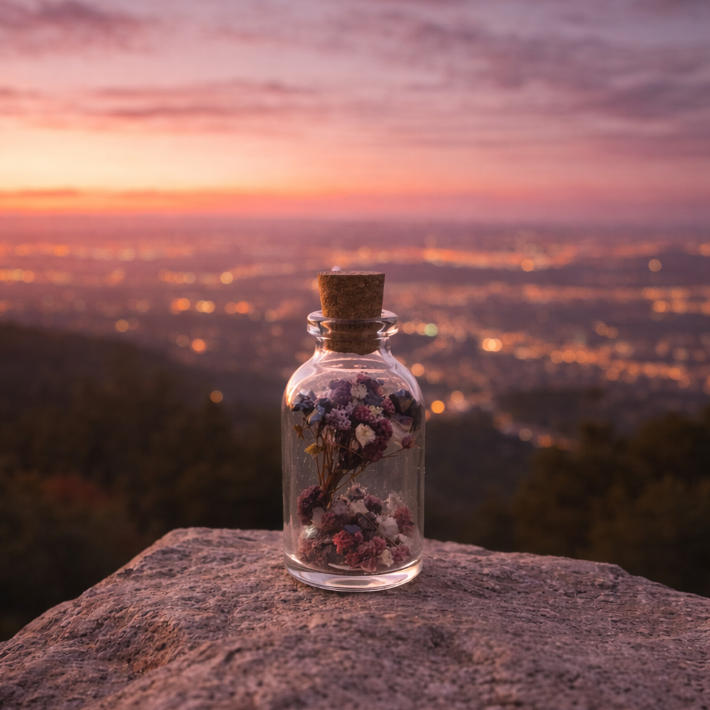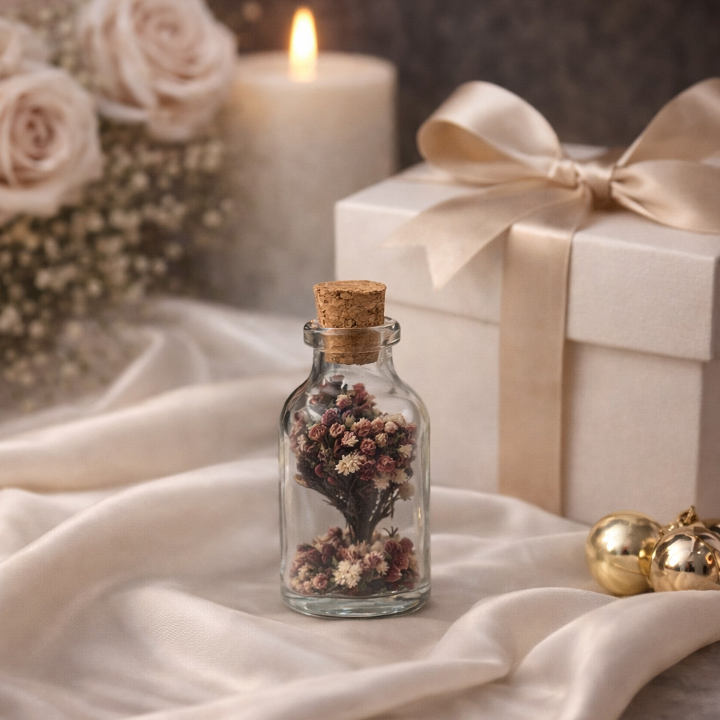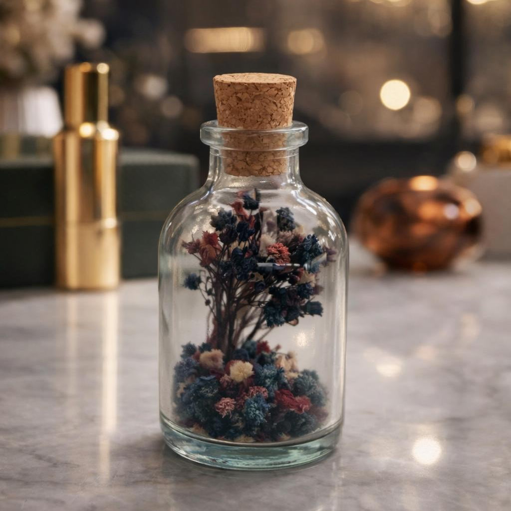 Gizli Bahçe, derin renkleri ve çarpıcı çiçek dokusuyla güçlü bir karakter taşır. Cam şişe içinde yer alan koyu tonlu kurutulmuş çiçekler, gizemli ve sofistike bir atmosfer oluşturur. Mantar kapak detayı ile doğal dokunuş tamamlanır.